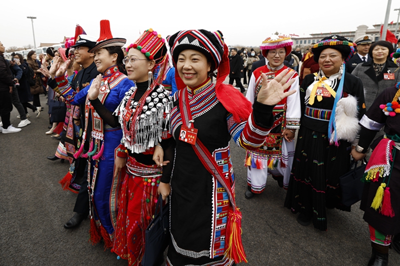 3月4日,身着民族服饰的政协委员们走向人民大会堂,准备参加全国政协十四届二次会议开幕会。