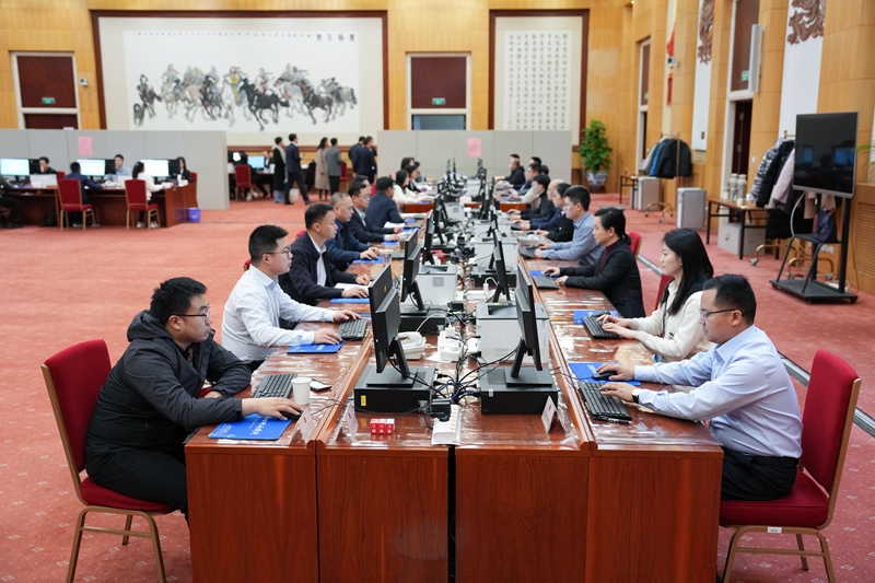 2025年3月9日,十四届全国人大三次会议秘书处工作人员在认真工作。新华社记者 郑焕松 摄