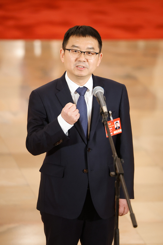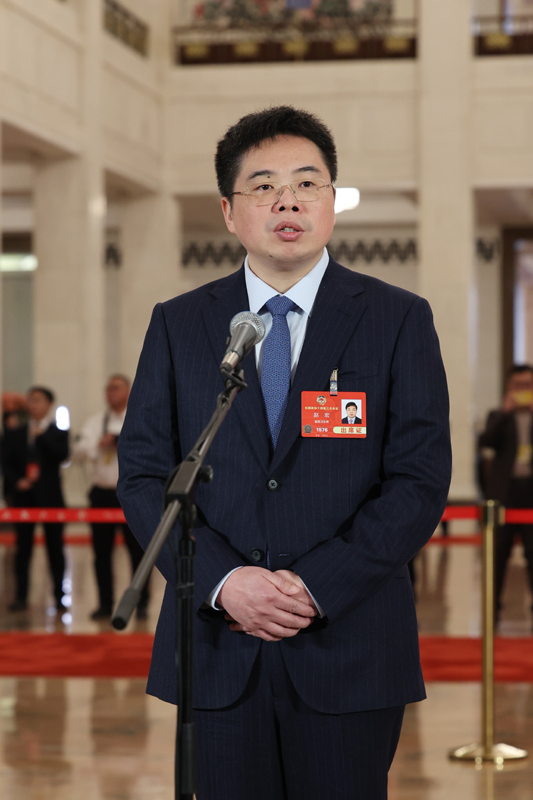 3月4日,全国政协十四届三次会议首场“委员通道”集体采访活动在北京人民大会堂举行。这是全国政协委员严建兵接受媒体采访。