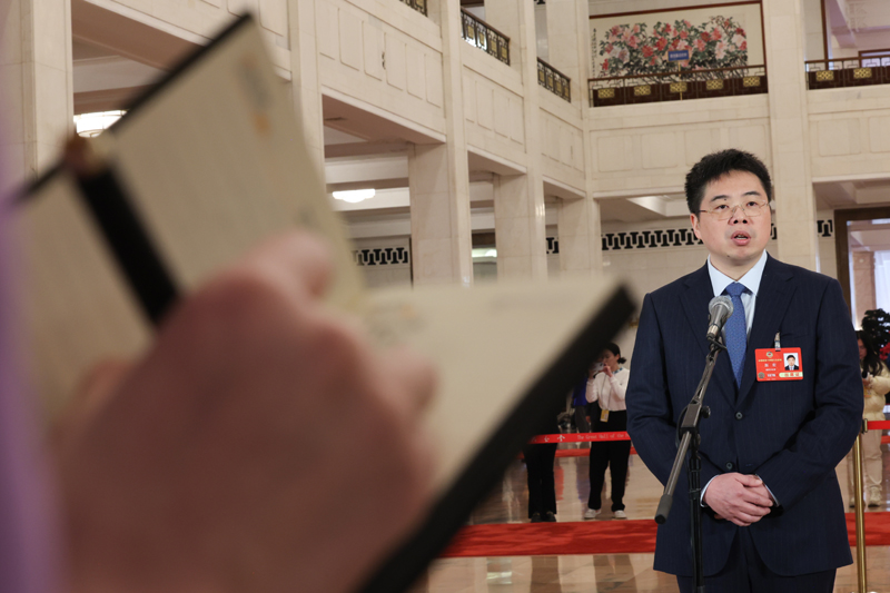 3月4日,全国政协十四届三次会议首场“委员通道”集体采访活动在北京人民大会堂举行。这是全国政协委员黄绵松接受媒体采访。
