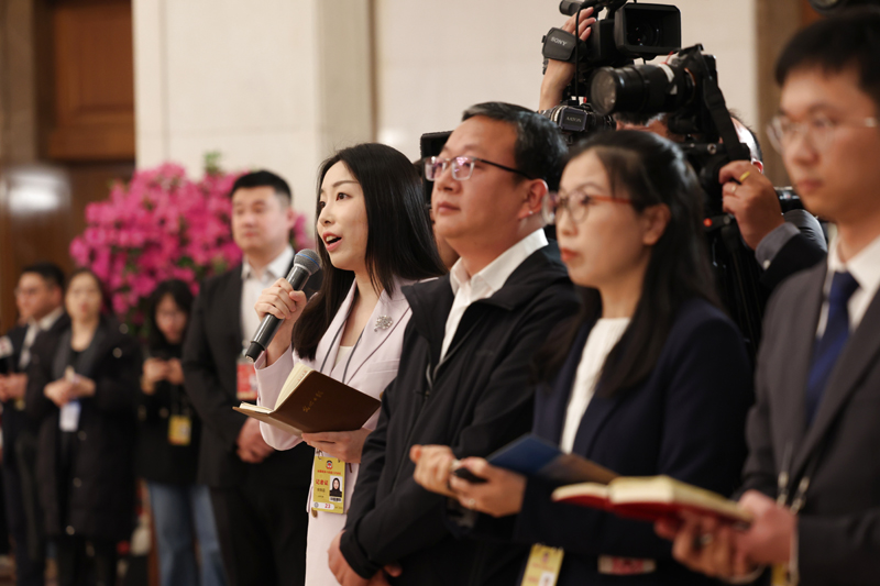3月4日,全国政协十四届三次会议首场“委员通道”集体采访活动在北京人民大会堂举行。这是新华社记者在提问。