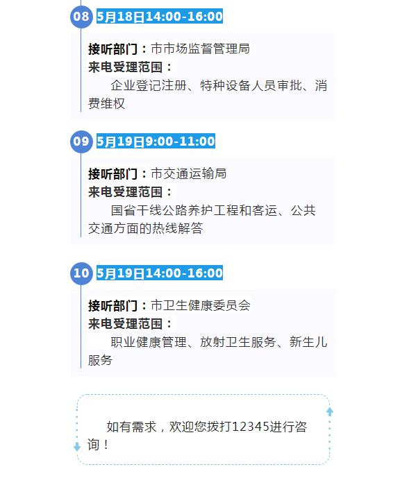 本次“企业诉求热线解”活动,将通过12345热线,线上解答企业群众关心的热点难点问题。住建、营商、商务、人社、招商引资、公安、文旅广电、市场监管、交通、卫健等10个部门行业的业务专家将做客市12345热线,围绕优化政策服务,打造一流营商环境等热点难点、诉求高频事项及最新政策,为企业群众答疑解惑。按照日程安排,每个部门做客时间约为2小时。