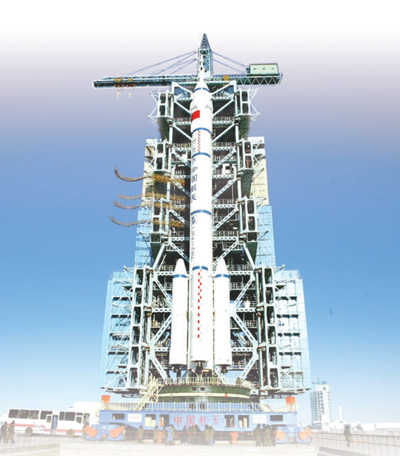 2002年12月,神舟四号船箭塔组合体转运到发射塔架上。 |