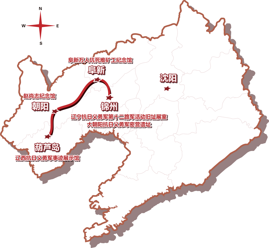 辽宁抗日义勇军第十二路军活动旧址展室—大朝阳抗日义勇军密营遗址—赵尚志纪念馆—阜新万人坑死难矿工纪念馆—辽西抗日义勇军事迹展示馆
