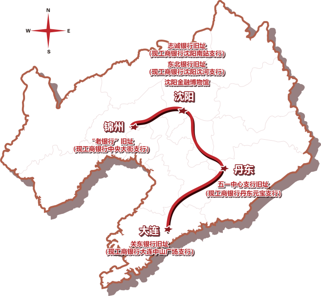 东北银行旧址(现工商银行沈阳沈河支行)—志诚银行旧址(现工商银行沈阳南站支行)—五一中心支行旧址(现工商银行丹东元宝支行)—“老银行”旧址(现工商银行锦州中央大街支行)—关东银行旧址(现工商银行大连中山广场支行)—沈阳金融博物馆