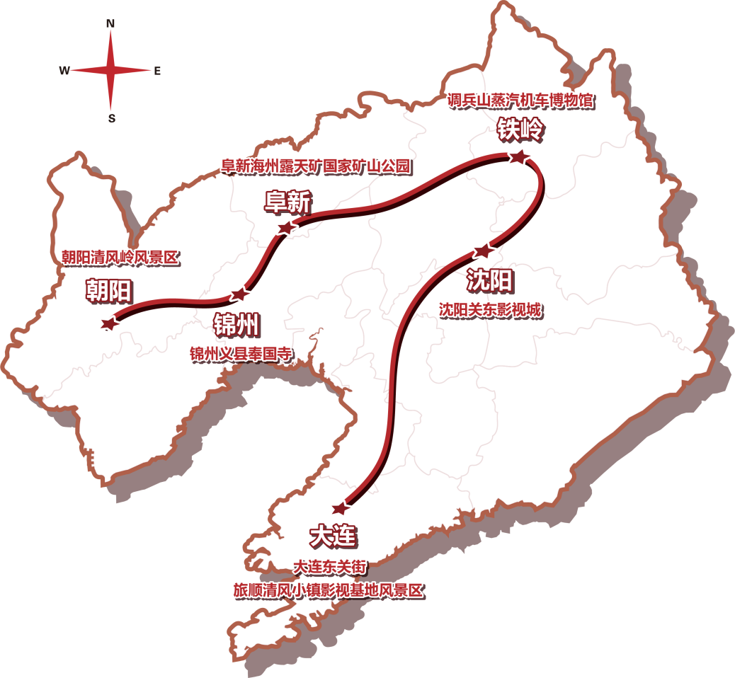 线路节点:旅顺清风小镇影视基地风景区—大连东关街—沈阳关东影视城—调兵山蒸汽机车博物馆—阜新海州露天矿国家矿山公园—锦州义县奉国寺—朝阳清风岭风景区