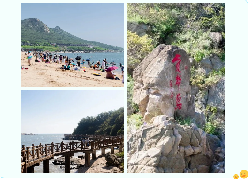 ●生态呼吸:1.1公里亲海木栈道串起碧海与密林,松涛与浪声交织成天然白噪音;南海沿浴场7万平方米的沙滩如金沙铺就,可同时容纳近万人戏水;怪石滩的海蚀石林似天然雕塑馆,在潮起潮落中演绎着大海的鬼斧神工。