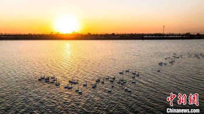 近日,北归候鸟在盘锦临空飞翔。