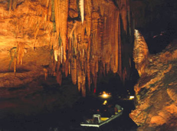 大厅正面,是通往水洞的码头,千余平方米的水面,宛如一幽静别致的“港湾”,灯光所及,水中游船、洞中石景倒映其中,使人如入仙境。从护岸石阶拾级而下,通过长廊从码头上船,即可畅游水洞。水洞全长5800米,现已开发2800米,面积3.6万平方米,空间40余万立方米,最开阔处高38米,宽70米。大厅正面有1000多平方米的水面,有码头可同时停泊游船40艘,泛舟则可畅游水洞,欣赏水洞之大、水洞之长、水洞之深、飞瀑之美,令人不得不惊叹:“钟乳奇峰景万千,轻舟碧水诗画间,钟秀只应仙界有,人间独此一洞天”。