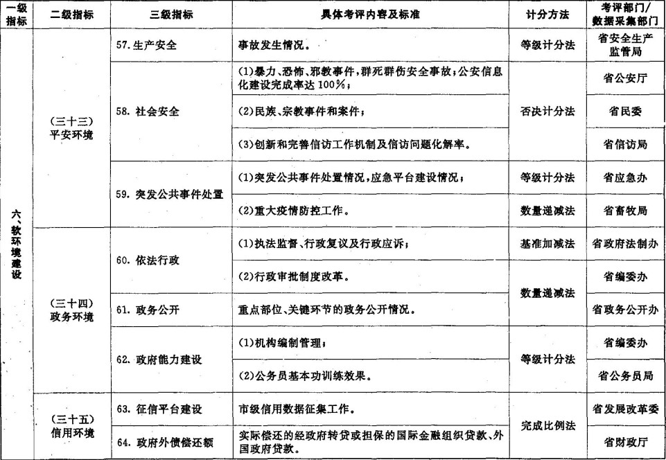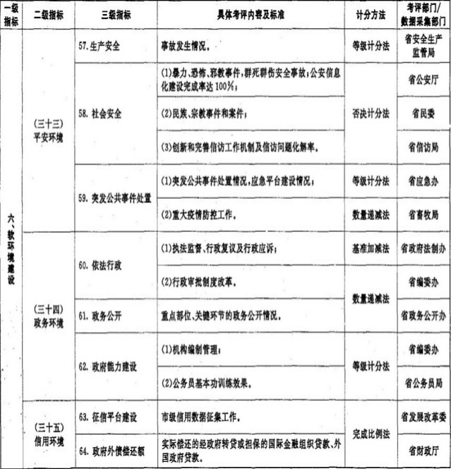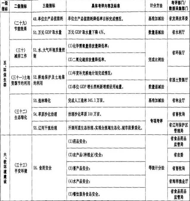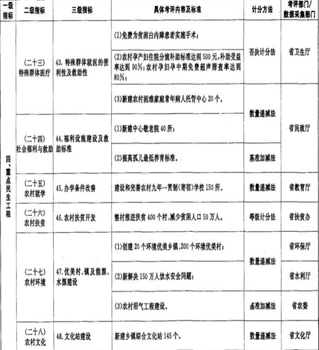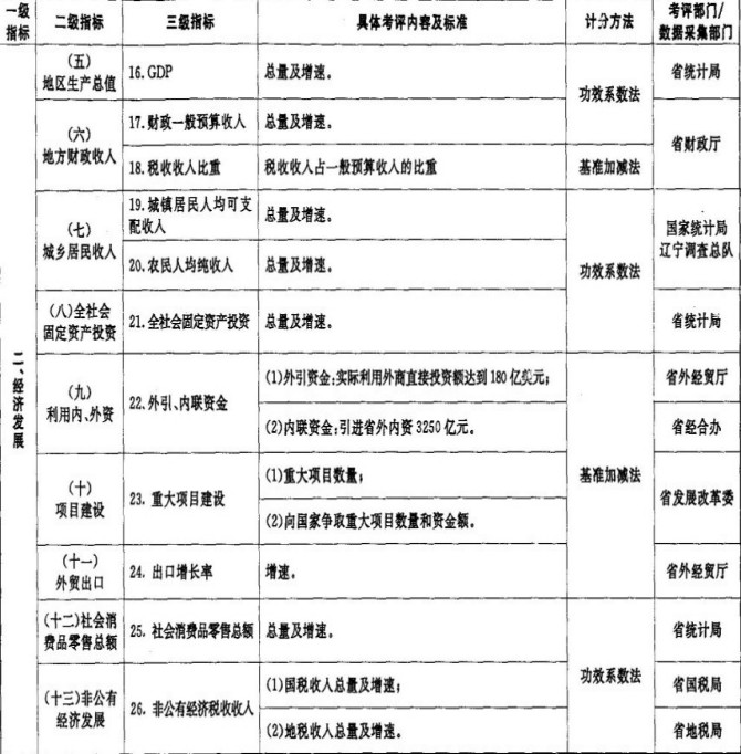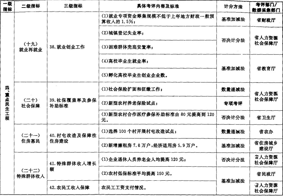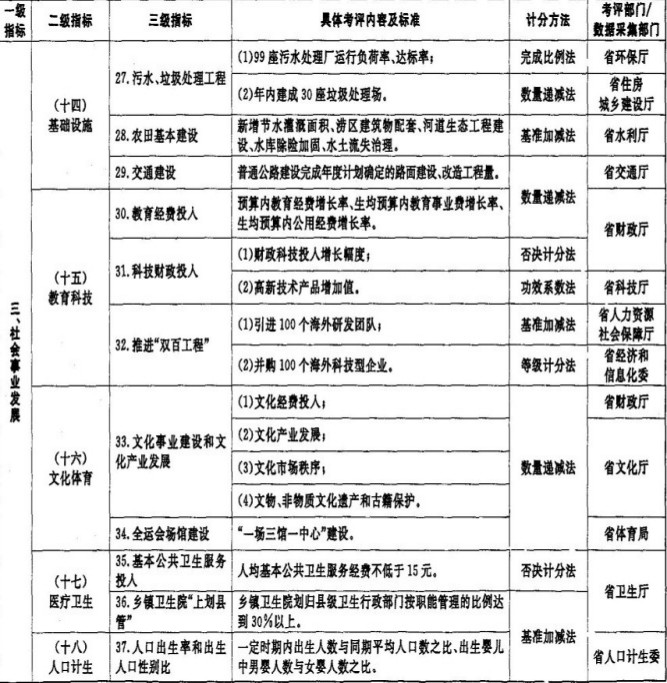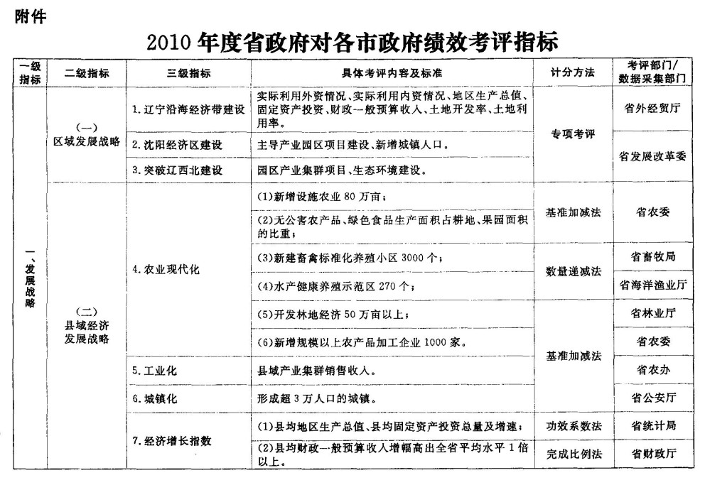省政府对各市政府绩效考评设置了指标考评、领导评价和社会评议三大体系,其实施细则由省政府绩效管理工作领导小组另行下发。指标考评实行千分制计分,分类采用完成比例法、数量递减法、否决计分法、功效系数法、等级计分法、基准加减法等计分方法。积极探索领导评价和社会评议工作,其结果作为对各市政府绩效综合考评排名的重要依据。对为全省做出突出贡献和造成严重社会不良影响的市政府分别在指标考评总分的基础上进行加分和减分。