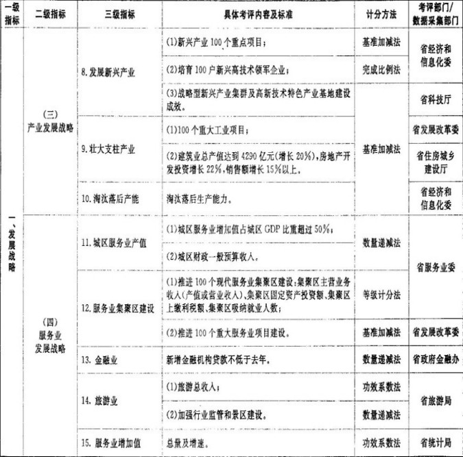2010年度省政府对各市政府绩效指标考评内容分为发展战略、经济发展、社会发展、民生工程、环保生态、软环境建设6个类别。