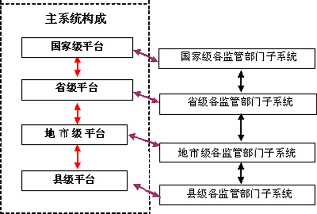 加强食品安全监管信息化建设的顶层设计,根据国家重大信息化工程建设规划的统一部署,建立功能完善、标准统一、信息共享、互联互通的国家食品安全信息平台(见下图)。国家食品安全信息平台由一个主系统(设国家、省、市、县四级平台)和各食品安全监管部门的相关子系统共同构成。主系统与各子系统建立横向联系网络。