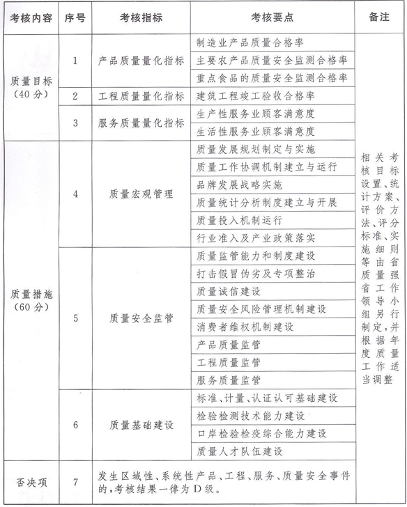 第四条 考核主要从产品质量、工程质量、服务质量等领域的质量安全和质量发展两个方面进行,包括质量目标完成情况和质量措施落实情况。具体考核要点见附件,相关考核指标及分值可根据年度质量工作进展适当调整。