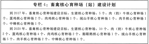 (一)大力发展现代种业。加强良种繁育体系建设,规范保种场和核心育种场的建设与管理。采取引进和自主选育相结合的办法,建设一批种畜禽核心育种场(站),到2020年,畜禽核心育种场达到27个,其中:生猪核心育种场10个,肉(奶)牛核心育种场2个,蛋鸡核心育种场4个,肉鸡核心育种场2个,豁眼鹅核心育种场1个,绒山羊核心育种场5个,肉羊核心育种场2个,中蜂核心育种场1个。提高荷包猪等11个地方畜禽品种资源保护成效,持续实施荷包猪、辽宁黑猪、辽育白牛、沿江牛、复州牛、辽宁绒山羊、东北细毛羊、东北半细毛羊、豁眼鹅、大骨鸡、中华蜜蜂等11个现有地方畜禽品种及新培育地方品种资源保护工程,力争实现保种群体数量稳定增加、质量有所提升。强化种畜企业创新主体地位,提升种源质量和自主创新能力,推进“育引繁推”一体化,建设育种产业化生产企业。进一步加大辽宁绒山羊、辽育白牛选育和开发利用力度,巩固和扩大应用成果,建成全国种源供给基地。力争到2018年,辽丹黑猪通过国家新品种审定;到2020年,利复牛、辽宁绒山羊(常年长绒型、肉绒兼用型)新品系取得阶段性成果。建成种猪生产性能测定中心及奶牛生产性能、羊绒毛质量检测平台,到2019年建成辽宁省种猪质量检验测试中心、省奶牛DHI平台、省羊绒毛质量检验测试平台,提高第三方检测评估能力,全面提升种畜禽质量和核心竞争力。支持肉用基础母牛扩群增量,落实好国家基础母牛扩群增量补助政策,提升基础母牛占牛群比重及生产水平,实现基础母牛存栏量持续增长。