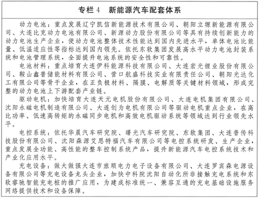 (四)加快培育新能源汽车配套体系。以华晨汽车集团、曙光汽车集团等龙头企业为引领,加强新能源汽车产业配套体系建设,带动关键零部件产业快速发展。以促进新能源汽车规模化发展为目标,积极发展动力电池、驱动电机、电控系统等新能源汽车关键零部件,电池关键材料和充电机、充电桩等配套基础设备,尽快形成规模化配套能力。(责任单位:省工业和信息化委)