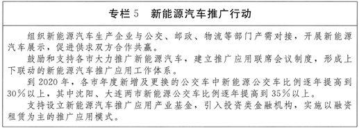 推广应用成效明显。新能源汽车在全省得到普及应用,在城市公交、出租、邮政、物流运输等公共领域推广应用比例显著提高。到2020年,各市年度新增及更换的公交车中新能源公交车比例逐年提高到30%以上,其中沈阳、大连两市逐年提高到35%以上。