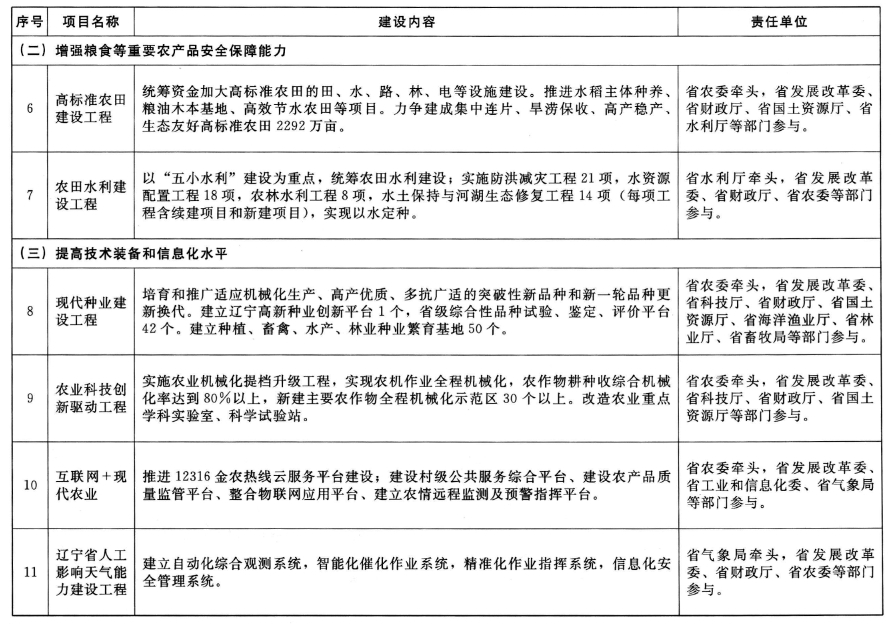 (一)创新强农工程。创新是农业现代化的第一动力,破解“三农”难题,必须坚持不懈推进体制机制创新,着力推进供给创新、科技创新和体制机制创新,着力强化物质装备和技术支撑,着力构建现代农业产业体系、生产体系、经营体系,加快实施藏粮于地、藏粮于技战略和创新驱动发展战略,培育更健康、更可持续的增长动力,激发亿万农民创新创业活力,释放农业农村发展新动能,根本转变高投入、高消耗、低产出的粗放式经营模式。