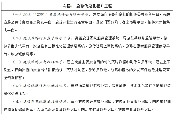 建设旅游产业大数据平台。构建全国旅游产业运行监测平台,建立旅游与公安、交通、统计等部门数据共享机制,形成旅游产业大数据平台。实施“互联网+旅游”创新创业行动计划。建设一批国家智慧旅游城市、智慧旅游景区、智慧旅游企业、智慧旅游乡村。支持“互联网+旅游目的地联盟”建设。规范旅游业与互联网金融合作,探索“互联网+旅游”新型消费信用体系。到“十三五”期末,在线旅游消费支出占旅游消费支出20%以上,4A级以上景区实现免费WiFi、智能导游、电子讲解、在线预订、信息推送等全覆盖。(国家旅游局、工业和信息化部、银监会等)