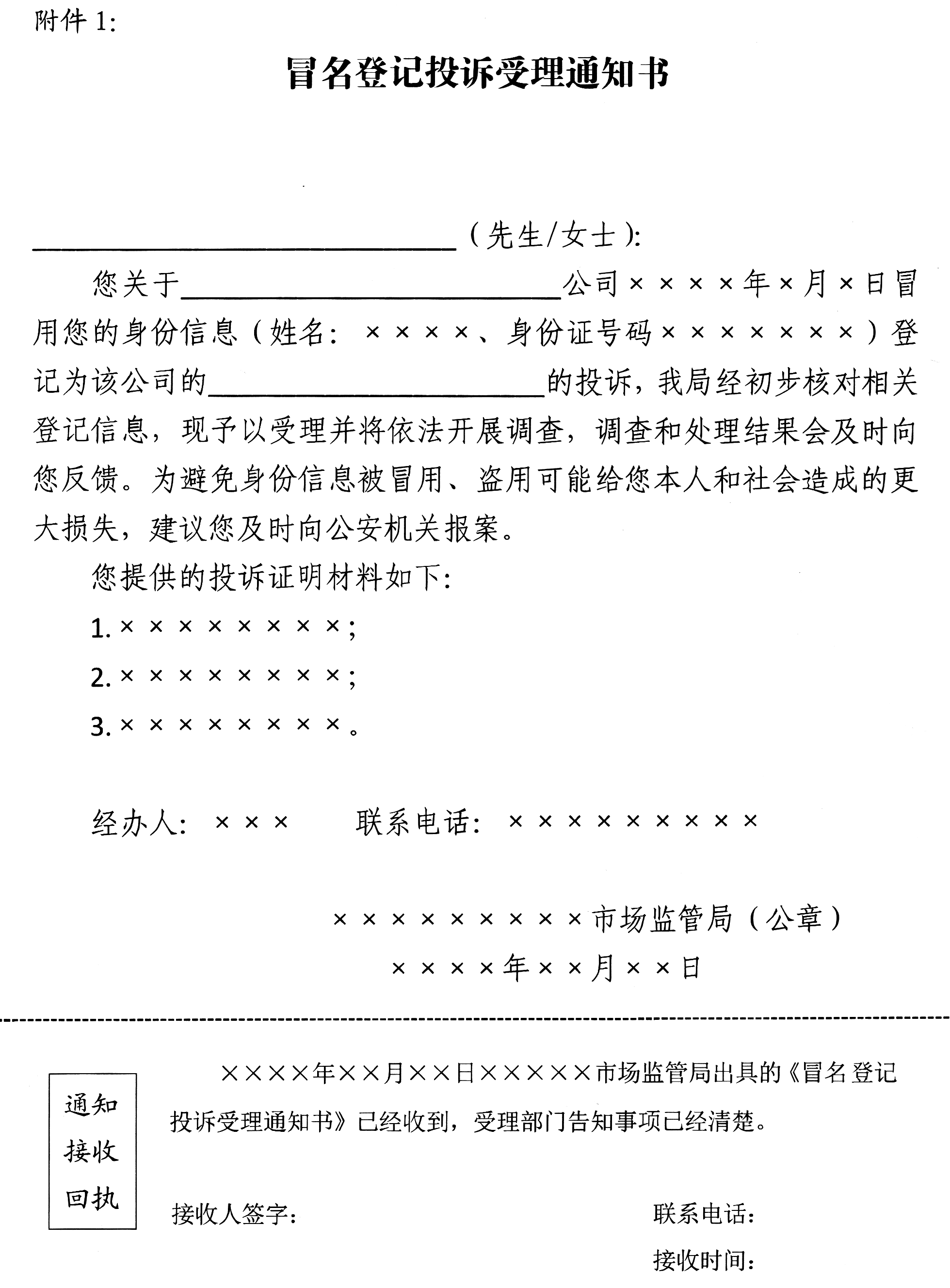 (三)建立受理登记。登记机关要根据投诉工作的有关办理规定,健全冒名登记投诉受理登记制度。身份被冒用的当事人(以下简称“投诉人”)可以本人到登记机关现场投诉,也可委托他人或由其法定代理人代为投诉,本人到场或委托他人到场确有困难的,也可通过电话或书面形式投诉。登记机关应当现场核验投诉人身份信息(通过委托代理人或者电话、书面形式投诉的,应当远程核验投诉人身份信息,法定代理人代为投诉的,应当有投诉人无民事行为能力或限制民事行为能力的证明,如户口本或相关部门出具的材料等),详细询问和记录身份被冒用的具体情况及主要诉求,经对相关公司登记信息初步查询比对,投诉指向符合的填写《撤销冒名公司登记申请表》、出具《冒名登记投诉受理通知书》,比对不符的出具《冒名登记投诉不予受理通知书》或直接告知投诉人确认相关具体信息后再行投诉,并将相关情况记录备查。受理投诉的同时,登记机关还应当告知投诉人及时向公安机关报案,避免身份证件及相关信息被冒用、盗用可能给本人和社会造成的更大损失。