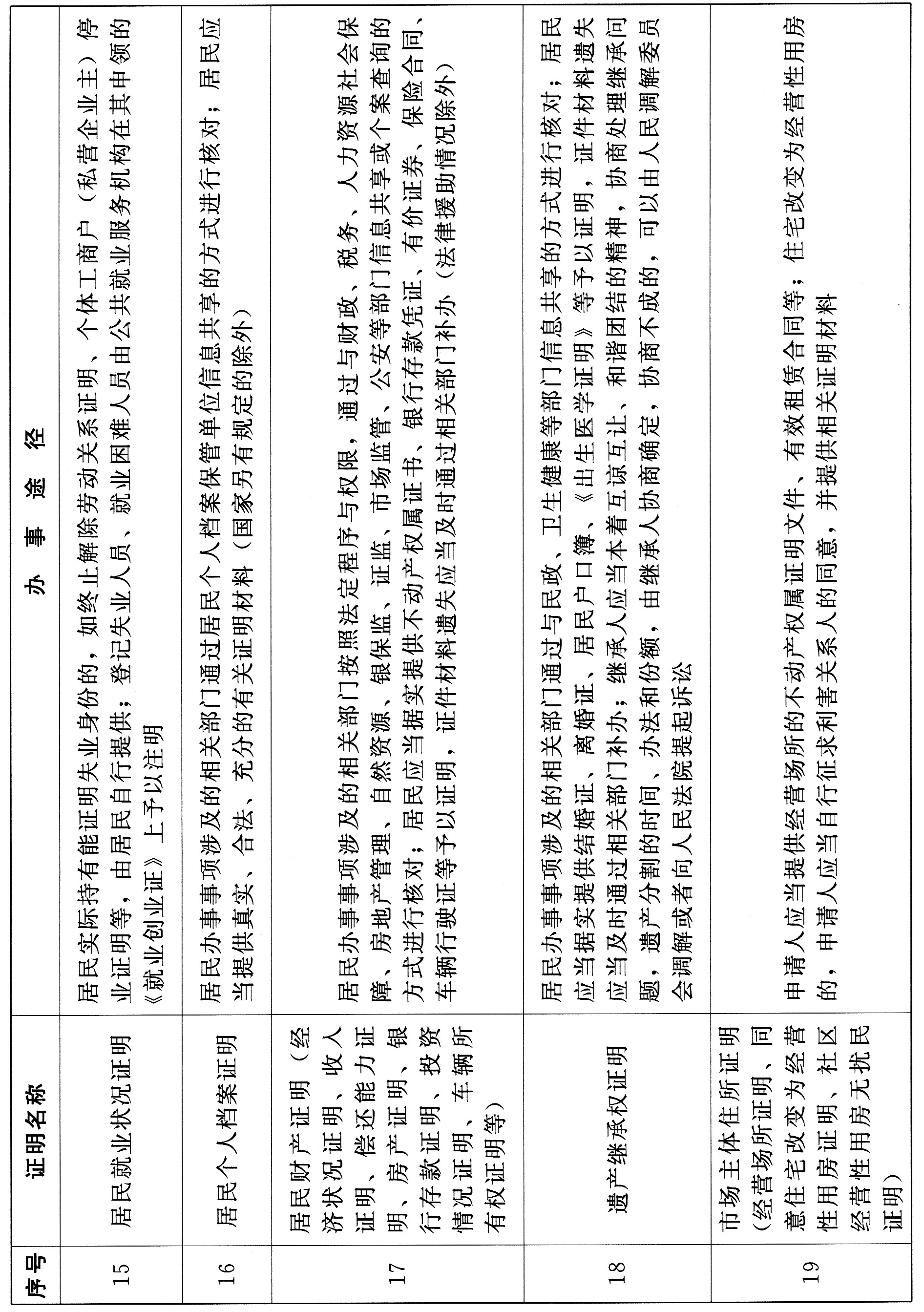 (一)明确证明事项。各市要制定基层群众性自治组织出具证明事项清单。基层群众性自治组织出具证明的事项,必须是有明确法律法规依据或经国务院批准列入保留证明事项清单、属于基层群众性自治组织职责范围的事项。凡是相关部门要求基层群众性自治组织出具证明事项的,应当同时提供基层群众性自治组织出具此证明事项的有关依据。凡是涉及城乡社区公共利益或者本辖区多数居民群众切身利益的事项需出具证明时,基层群众性自治组织应当通过组织居民群众议事协商等方式,经居民群众讨论同意并经基层群众性自治组织负责人签字后方可出具。凡是没有法律法规依据或未经国务院批准列入保留证明事项清单的证明事项,基层群众性自治组织不予出具。凡是法定证件能够证明的事项,基层群众性自治组织不再出具。
