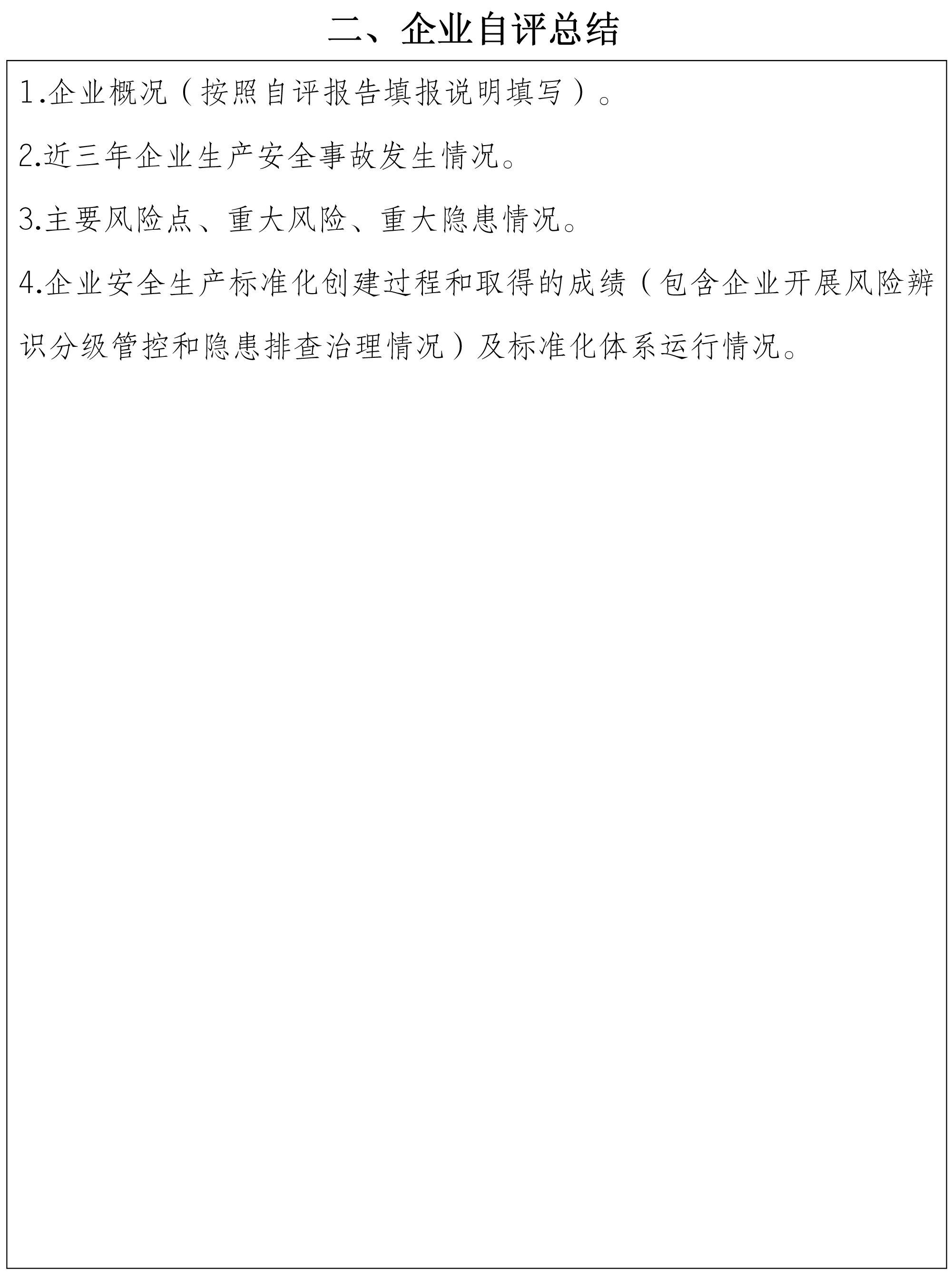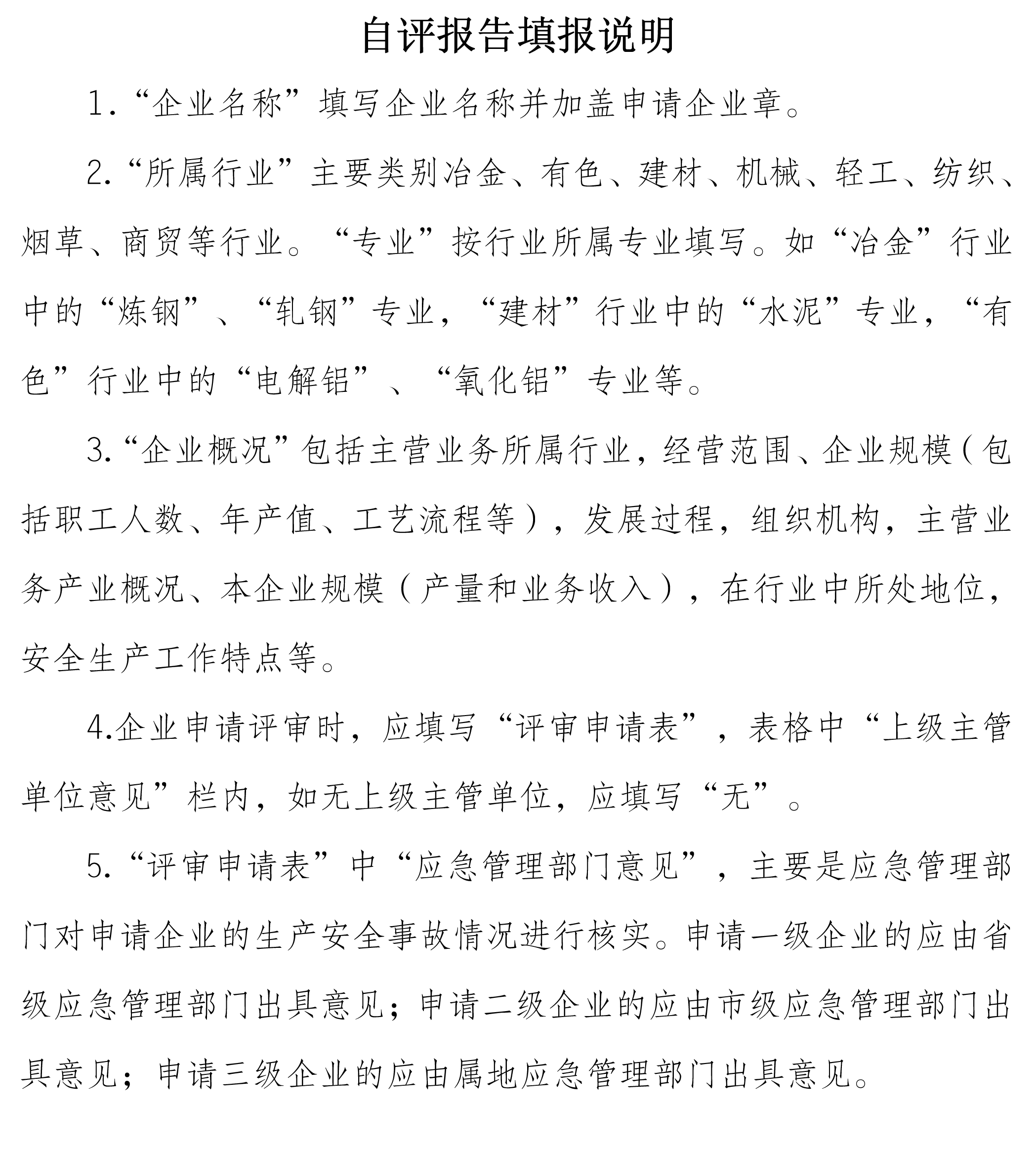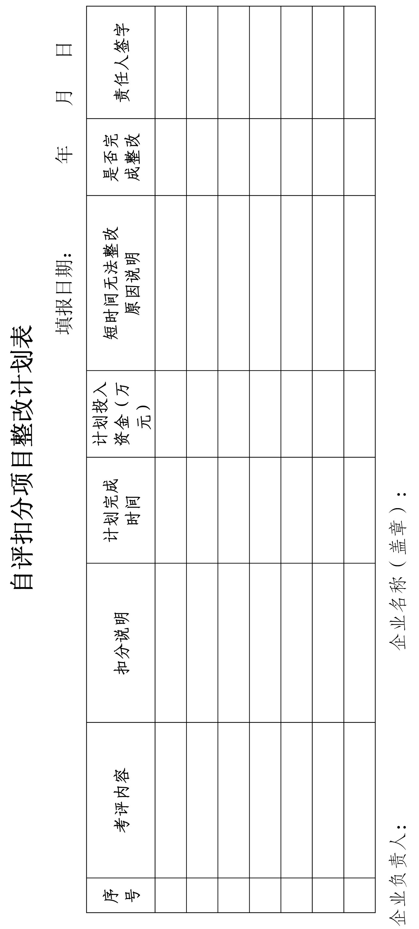 第十二条 企业自评结束后,应对自评扣分项目进行汇总,并逐项制定整改计划,确定整改时限、责任部门和责任人,落实整改资金,把问题和隐患逐项整改到位后形成自评报告(见附件1)。一时无法整改的,要落实防范措施,并在自评扣分项目汇总表相应栏内予以说明。自评报告应包括自评范围、工艺流程描述、评分表、自评扣分项目汇总表、整改计划及时限、责任部门、责任人和资金等。