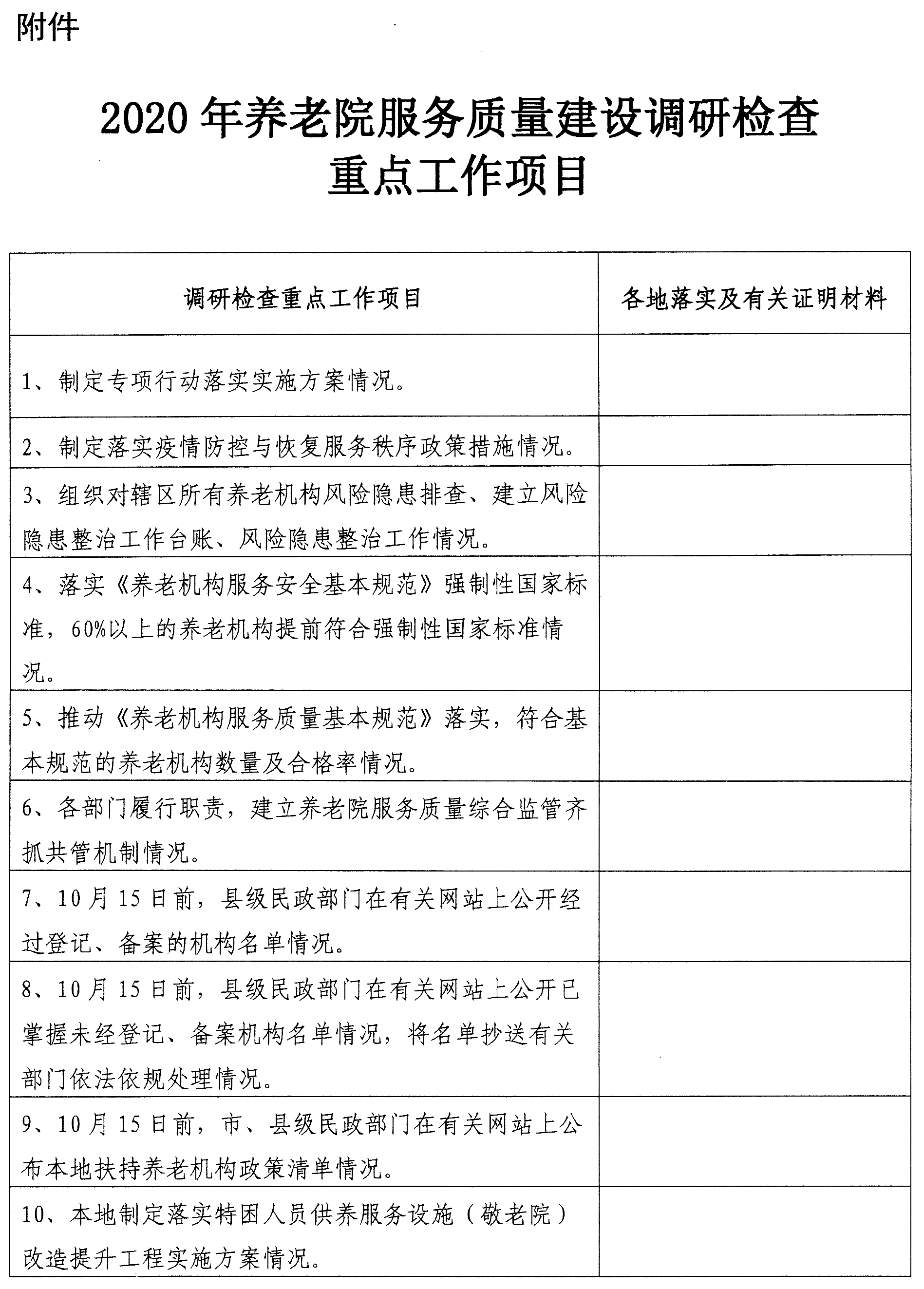 (四)开展调研指导。各地各有关部门要结合职能权限或联合组成工作组,对养老机构服务质量达标、隐患排查整治等情况开展调研指导或现场检查,定期对各地工作情况进行通报,建立健全常态化监管的长效机制。省民政厅、住房和城乡建设厅、卫生健康委、应急管理厅、市场监督管理局将于2020年10底前联合对各地开展专项行动四年成效进行验收。