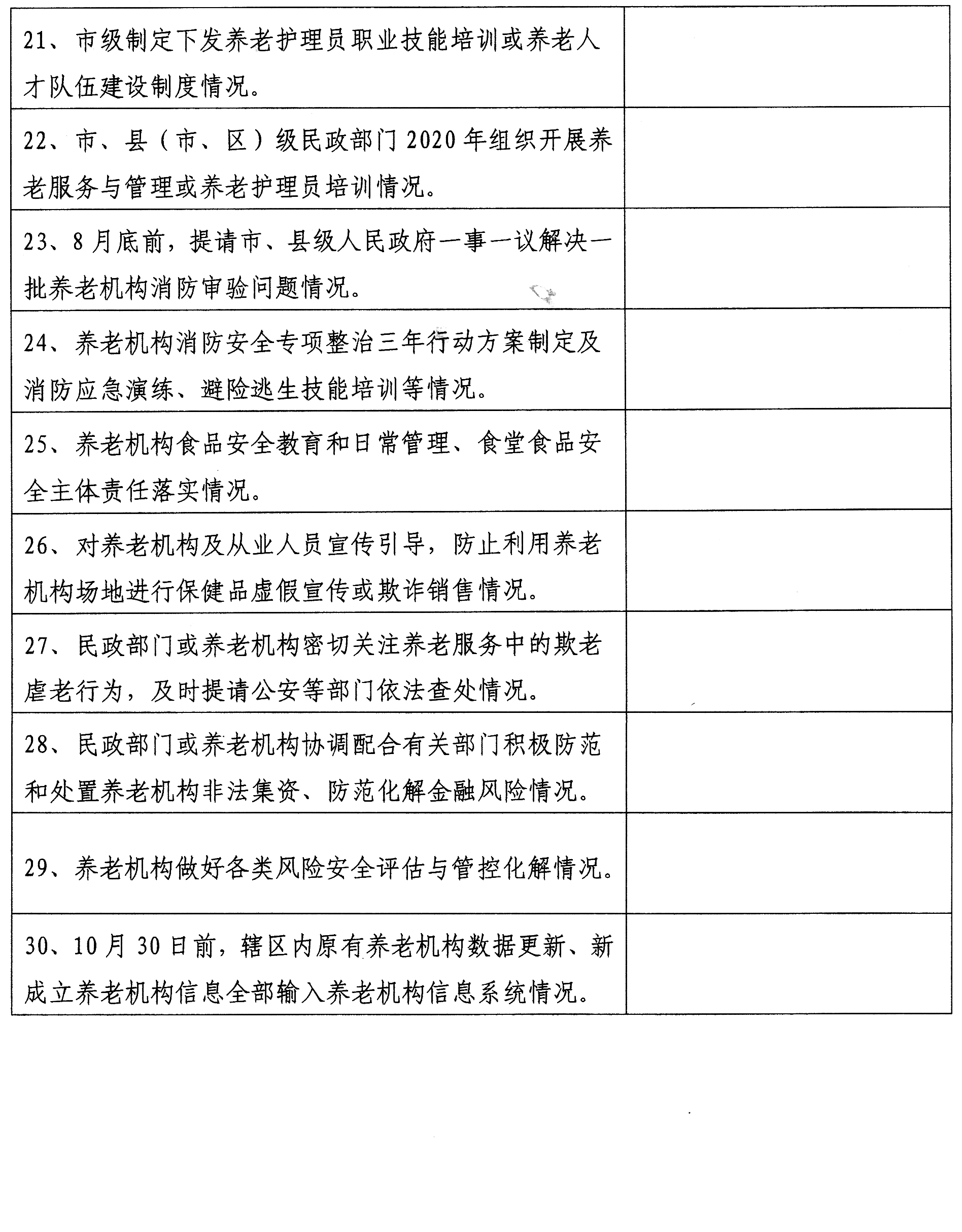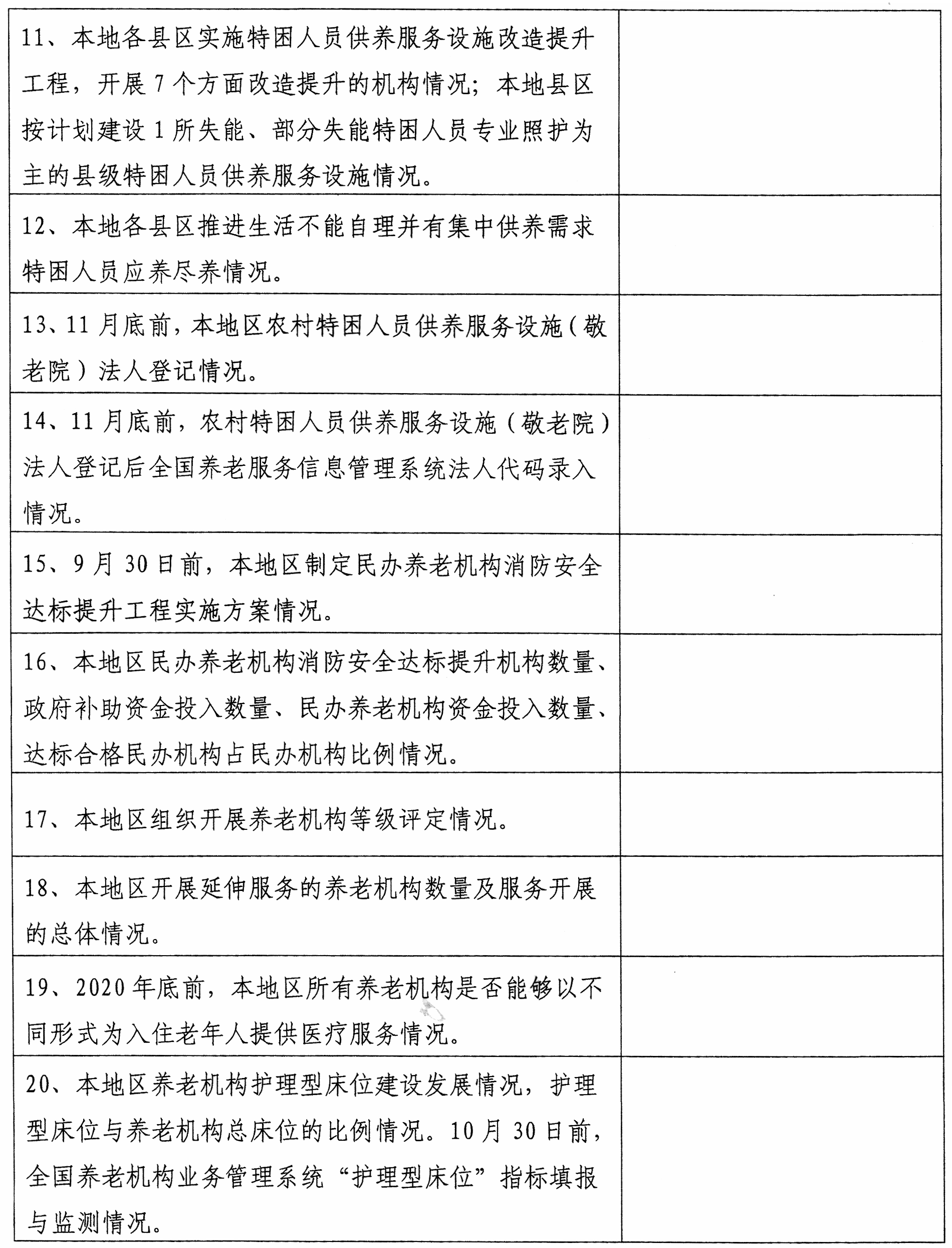 (十四)组织做好各类信息填报统计工作。各地要继续督促养老机构通过全国养老机构业务管理系统及时填报基础信息、实时更新数据和专项行动开展情况,10月30日前新成立的养老机构信息都要全部入库填报,为集中研判工作进展、动态督促落实提供数据支撑。