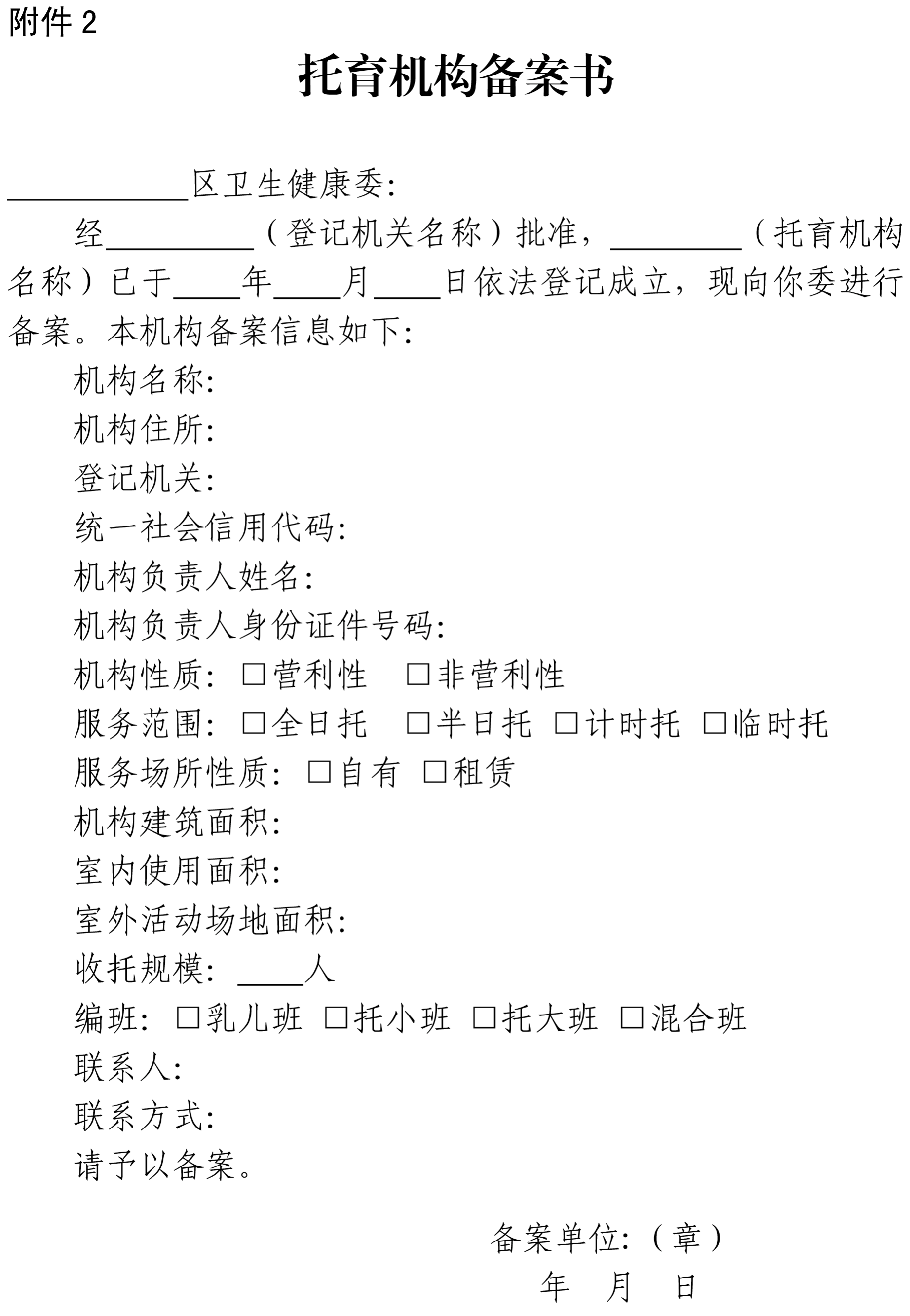 第十七条 托育机构可通过托育机构备案信息系统(附件1)在线填写《托育机构备案书》(附件2)和《备案承诺书》(附件3),并提交以下材料扫描件: