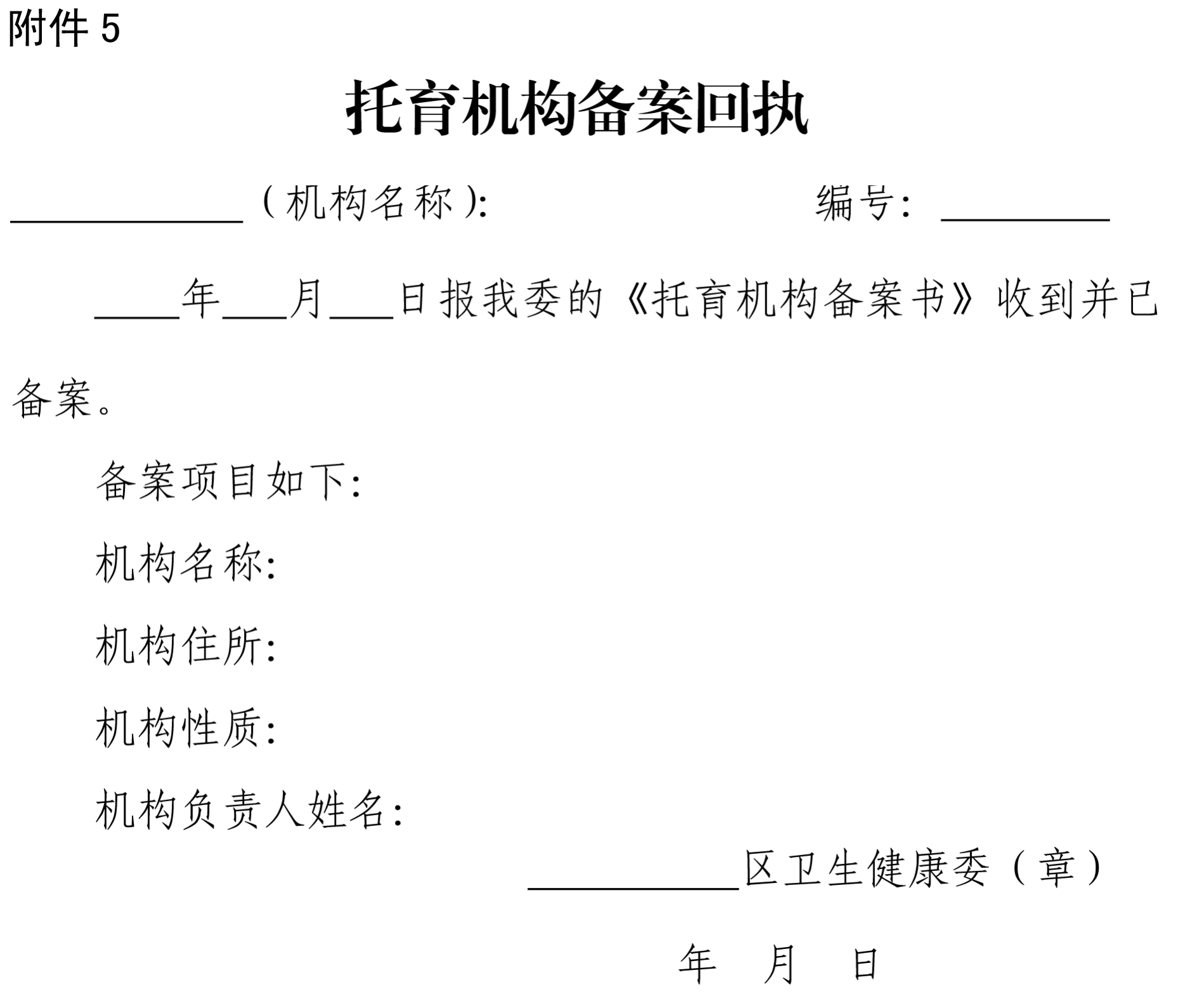 第十八条 区(县、市)卫生健康主管部门在收到托育机构备案材料后,应当在5个工作日内通过托育机构备案信息系统提供备案回执(附件5)和基本条件告知书(附件6)。