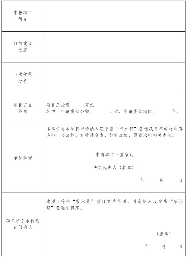 (一)项目申请。申请单位提出贷款申请,登录“辽宁省水利厅网站(https://slt.ln.gov.cn)—节水贷”提出申请,填写《辽宁省“节水贷”项目申请表》(见附件)。为保障申报材料真实性,申请单位需要在“单位承诺”栏加盖单位及法定代表人印章。申请单位可根据实际情况,按照属地原则自主选择县级或市级水行政主管部门提交审核。