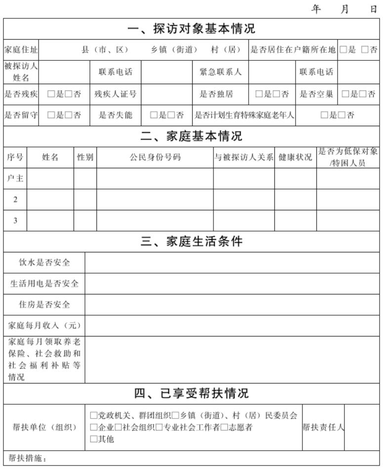 (二)全面开展入户摸底调查。各县(市、区)民政部门要指导乡镇(街道)民政办、民政服务站(原社会工作站)以村(社区)为单元全面开展辖区老年人摸底调查工作,村(居)民委员会协助实施。要以村(社区)为单元,建立辖区内的特殊困难老年人基本信息台账,及时录入、更新和归集特殊困难老年人基本信息和探访关爱服务需求,为政府和社会力量实施探访关爱服务提供数据支撑。