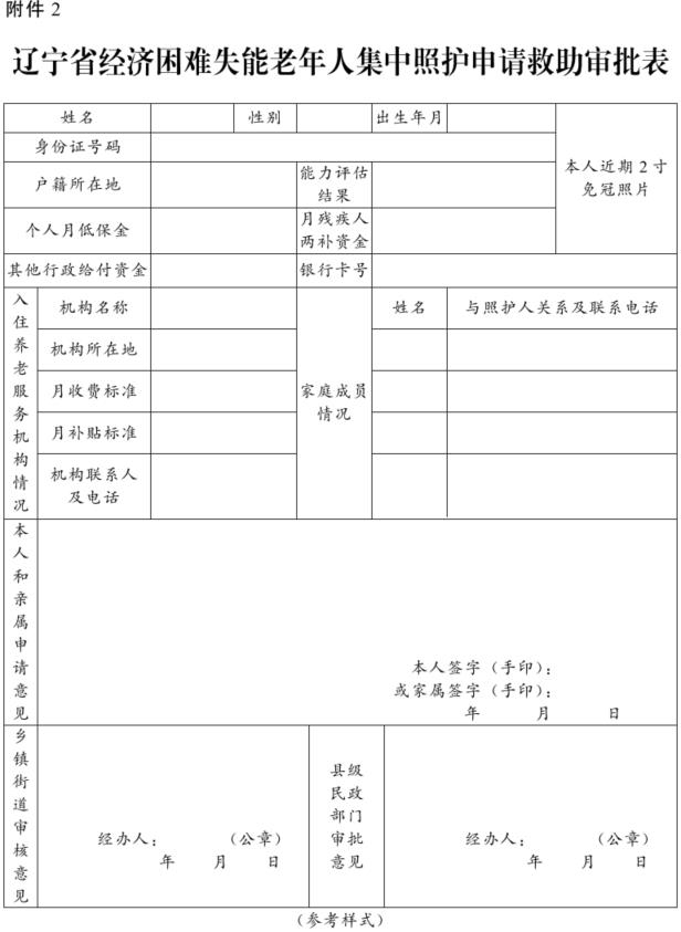 2.辽宁省经济困难失能老年人集中照护申请救助审批表(参考样式)