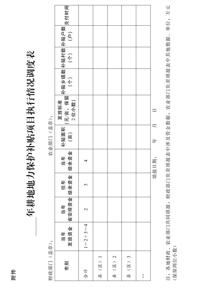 各市于2024年7月底前以正式文件形式向省农业农村厅、省财政厅上报耕地地力保护补贴年度工作总结,总结内容应包括年度项目执行情况、补贴资金发放情况等,并附《年耕地地力保护补贴项目执行情况调度表》(附件)。各市要对上报数据进行严格审核,省将以各市上报的数据作为报送国家绩效自评报告的依据。