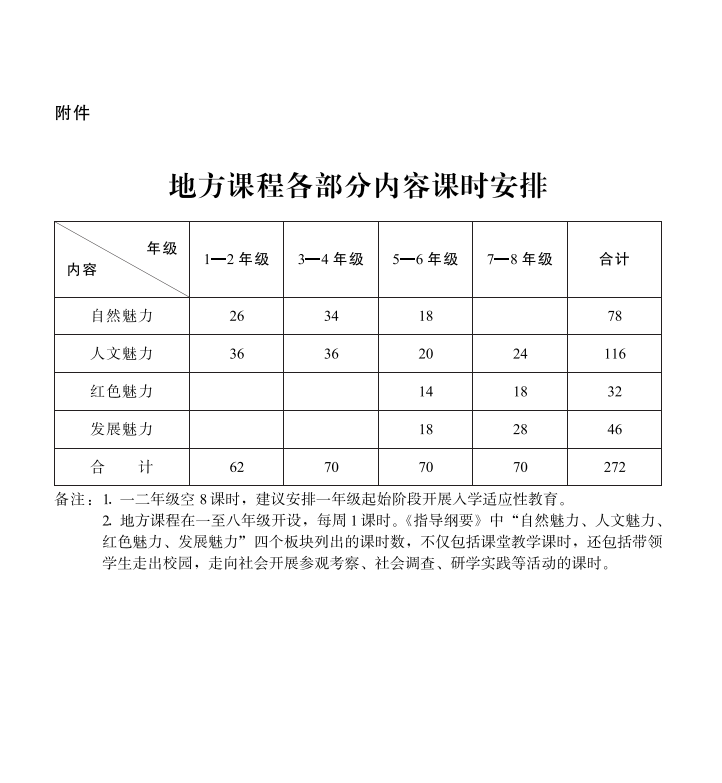 地方课程在一至八年级开设,每周1课时。“自然魅力、人文魅力、红色魅力、发展魅力”四个板块列出的课时数,不仅包括课堂教学课时,还包括带领学生走出校园,走向社会开展参观考察、社会调查、研学实践等活动的课时。教师要掌握地方课程的性质和理念,按照课程目标和内容要求进行课程设计,优化组织形式,提高课程实施水平。
