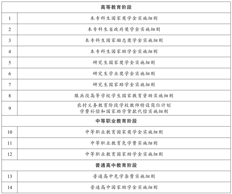 第二条 本办法所称学生资助资金是指中央及省财政用于落实高等教育(含本专科生和研究生教育)、中等职业教育、普通高中教育等国家资助政策的资金,包括国家奖学金、省政府奖学金、国家励志奖学金、学业奖学金、国家助学金、免学(杂)费补助资金、服兵役高等学校学生国家教育资助资金、基层就业学费补偿国家助学贷款代偿资金、国家助学贷款奖补资金等。