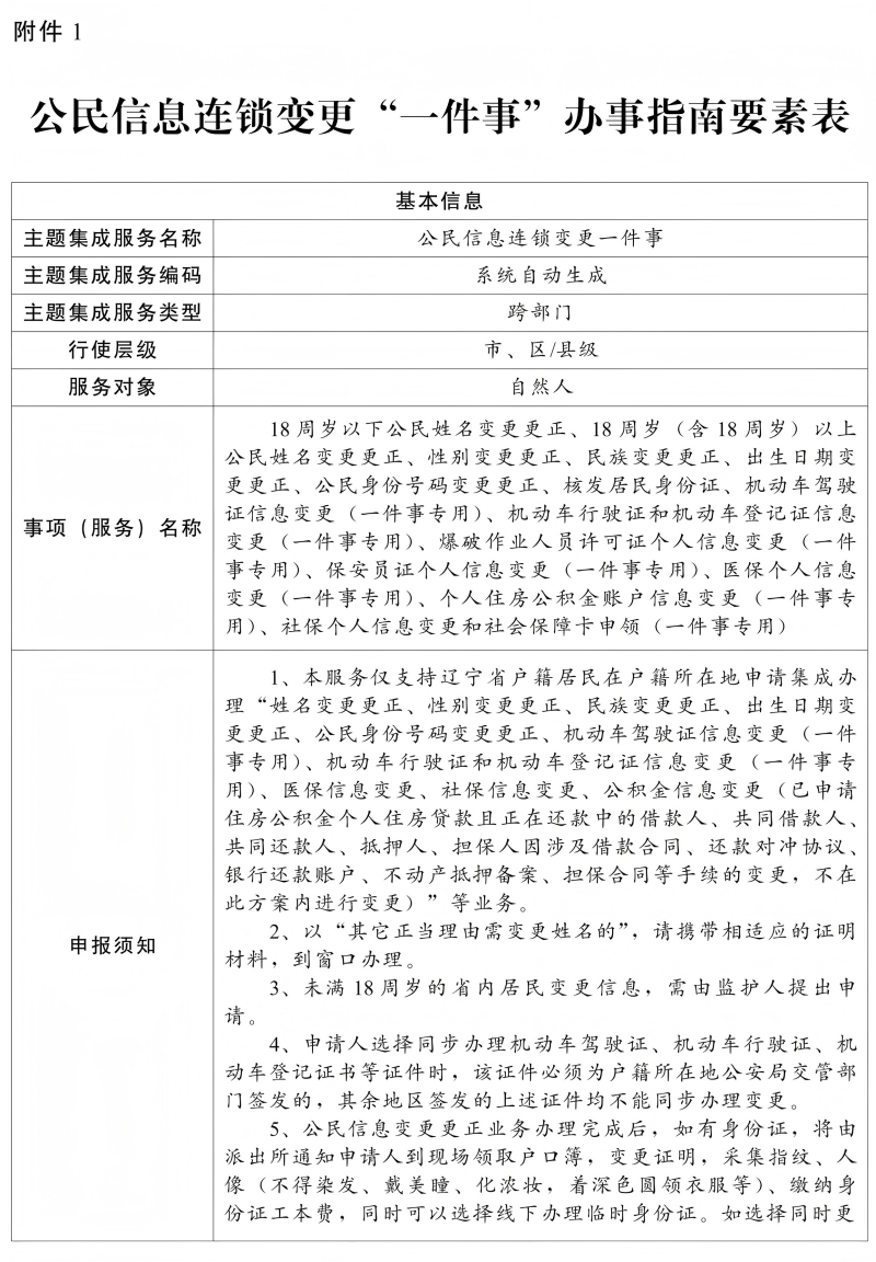 1.公安类事项的办理及信息变更。公民通过辽宁政务服务网进入“高效办成一件事”办理专栏中的公民信息连锁变更“一件事”专区,依法依规申请变更或更正姓名、性别、民族、出生日期、公民身份号码等基本信息,同时按照系统提示选择其他信息变更。在公安机关内部,对申请人申请办理居民身份证、机动车驾驶证、机动车登记证、机动车行驶证、保安员证、爆破作业人员许可证等业务时,通过数据推送等方式办理。