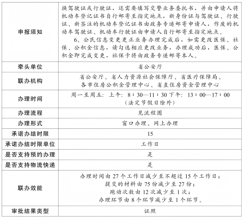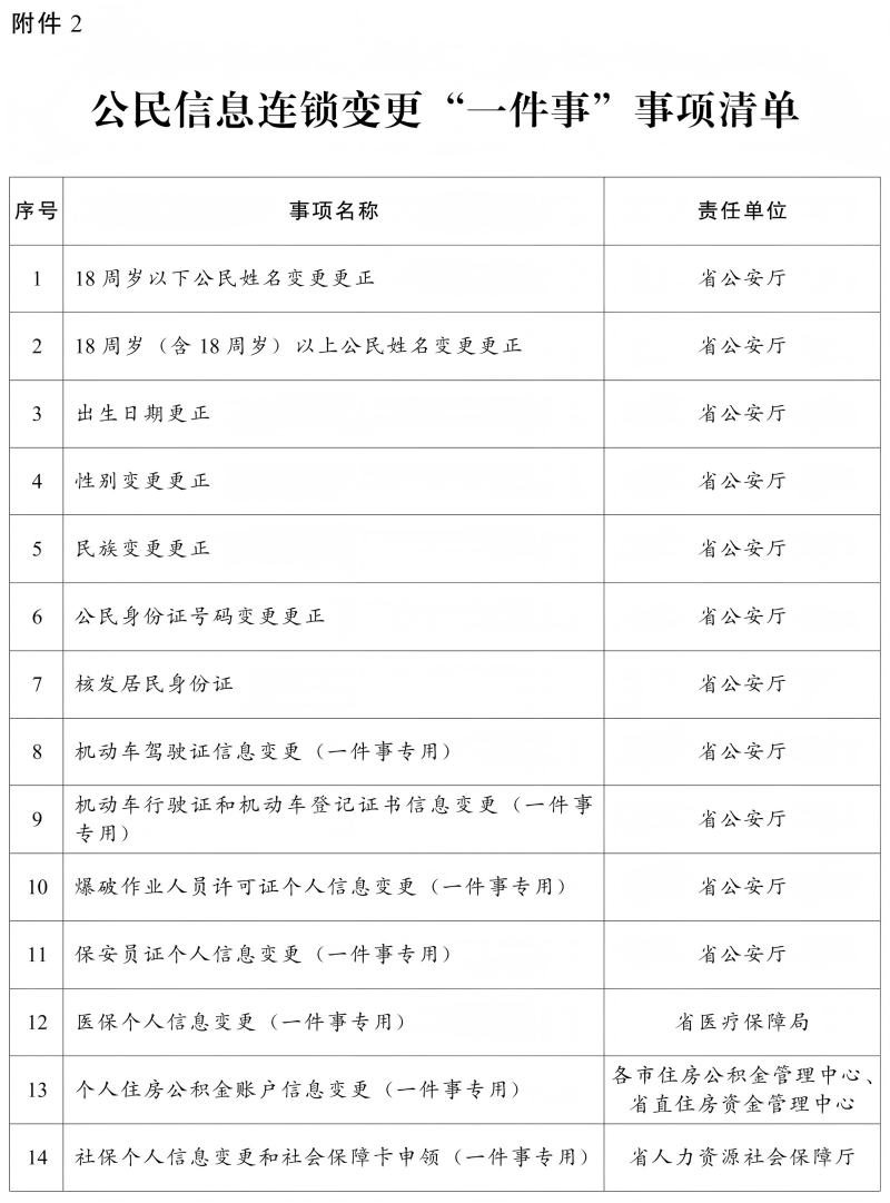 省公安厅:牵头负责公民信息连锁变更“一件事”整体推进,制定实施方案以及办理指南,联合省数据局(省营商局)、省人力资源社会保障厅、省医疗保障局、省住房城乡建设厅,做好部门业务系统对接工作,优化公民信息连锁变更“一件事”联办服务。负责公民信息变更后的居民身份证、机动车驾驶证、机动车登记证、机动车行驶证、保安员证、爆破作业人员许可证等公安业务的办理。