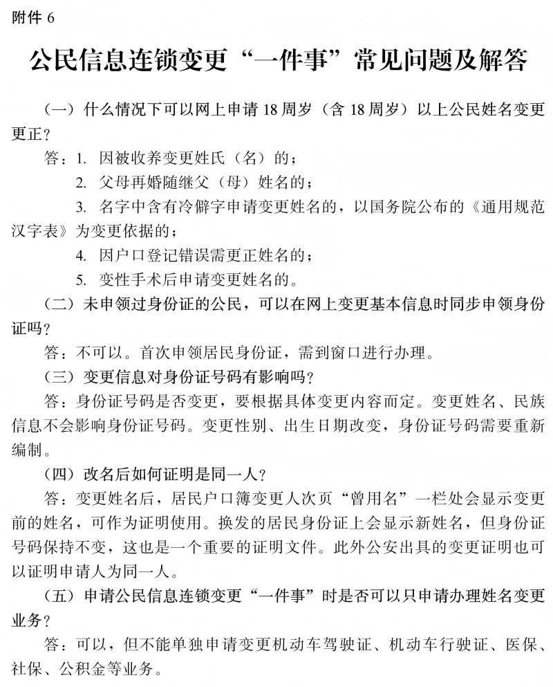 深入推进公民信息连锁变更“一件事”服务模式,围绕公民姓名、性别、民族、出生日期和公民身份号码等基本信息变更,依托一体化政务服务平台,实现公安、人社、医保、住建等部门服务流程信息共享,通过线上线下融合,优化审批流程,实现公民信息变更“只填一张表,无需多头跑,办成多件事”,缩短办理时间,提升群众满意度。