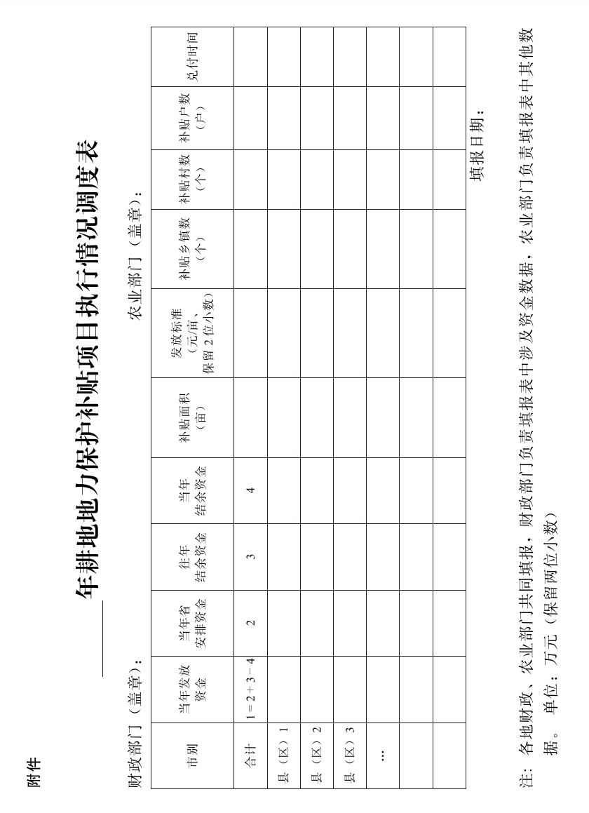 (五)做好年度工作总结。各市于2025年7月底前以正式文件形式向省农业农村厅、省财政厅上报耕地地力保护补贴年度总工作总结,总结内容应包括年度项目执行情况、补贴资金发放情况等,并附《 年耕地地力保护补贴项目执行情况调度表》(附件)。各市要对上报数据进行严格审核,省将以各市上报的数据作为报送国家绩效自评报告的依据。