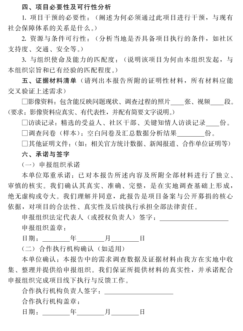 7.健全双重审核机制。具有公募资格的慈善组织通过“慈善中国”平台提交公开募捐方案备案材料的同时,应一并上传“线下执行方案”材料,材料包括《项目需求实地调查报告》(见附件)、《线下执行能力证明》和《资金使用与透明反馈承诺书》等;相关民政部门应对提交的材料认真审核把关,从源头上确保项目真实性,筑牢公信力基石。各级民政部门应结合年度检查、专项审计,对备案的项目进行线下随机抽查,对募捐周期长、金额大、涉及敏感领域(如大病救助、自然灾害)的项目,采取电话随访、要求提供阶段性执行记录或支出凭证、核对其在指定平台公布的信息是否与备案信息一致等简便易行的核查方法进行重点跟踪,形成常态化监管模式。