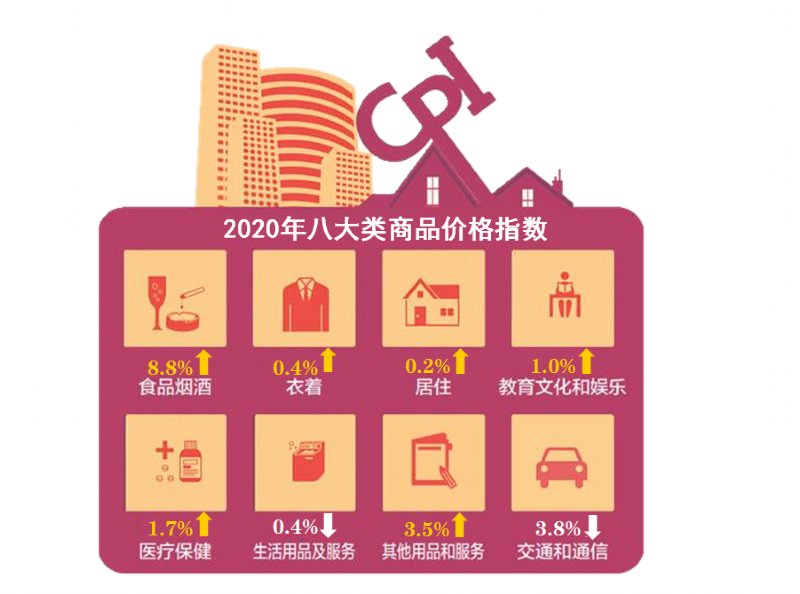 全年居民消费价格指数(CPI)比上年上涨2.6%。八大类商品呈“六涨两降”态势。分类别看,食品烟酒类价格上涨幅度最大,上涨8.8%;其他用品和服务类上涨居第二位,上涨3.5%;医疗保健类、教育文化和娱乐、衣着类和居住类分别上涨1.7%、1.0%、0.4%、和0.2%;下降的类别为生活用品及服务类、交通和通信类,分别下降0.4%和3.8%。