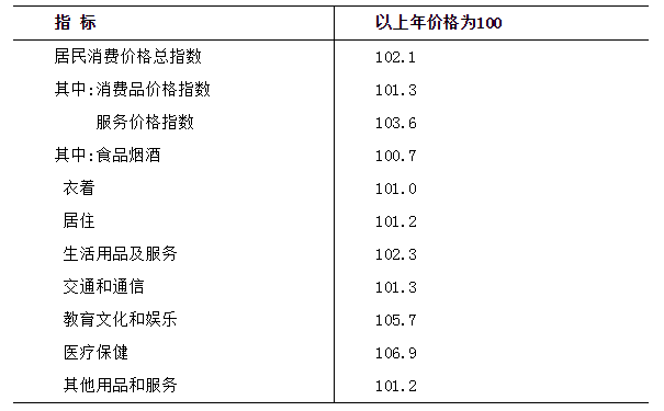全年居民消费价格比上年上涨2.1%,其中消费品价格上涨1.3%,服务价格上涨3.6%。工业生产者出厂价格比上年上涨4.6%。工业生产者购进价格比上年上涨9.8%。
