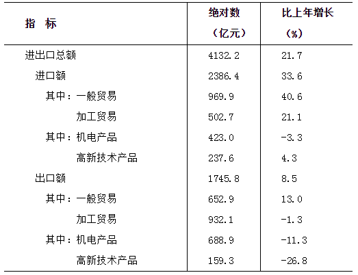 全年自营进出口总额4132.2亿元,比上年增长21.7%。其中,进口2386.4亿元,增长33.6%;出口1745.8亿元,增长8.5%。机电产品出口688.9亿元,下降11.3%,占39.5%。一般贸易出口652.9亿元,增长13%,占37.4%。民营企业出口578.7亿元,增长17.9%,占33.2%。前六大主要出口市场是东亚、日本、“一带一路”国家、北美、欧盟、美国。