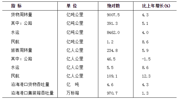 全年各种运输方式客货换算周转量9096.5亿吨公里,比上年增长4.3%。其中,货物周转量9007.5亿吨公里,增长4.3%;旅客周转量234.8亿人公里,增长5.9%。