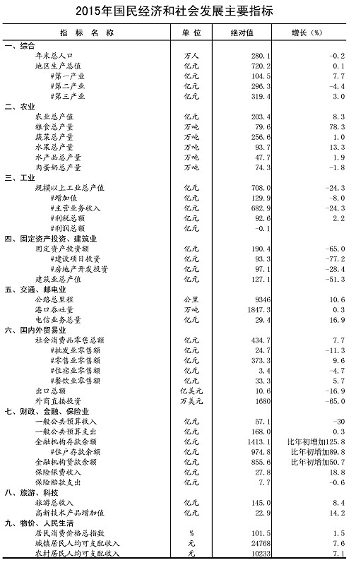 初步核算,全年地区生产总值720.2亿元,按可比价格计算,比上年增长0.1%。其中,第一产业增加值104.5亿元,增长7.7%;第二产业增加值296.3亿元,下降4.4%;第三产业增加值319.4亿元,增长3.0%。地区生产总值三次产业构成为14.5∶41.1∶44.4。人均地区生产总值28176元,比上年增长0.6%。