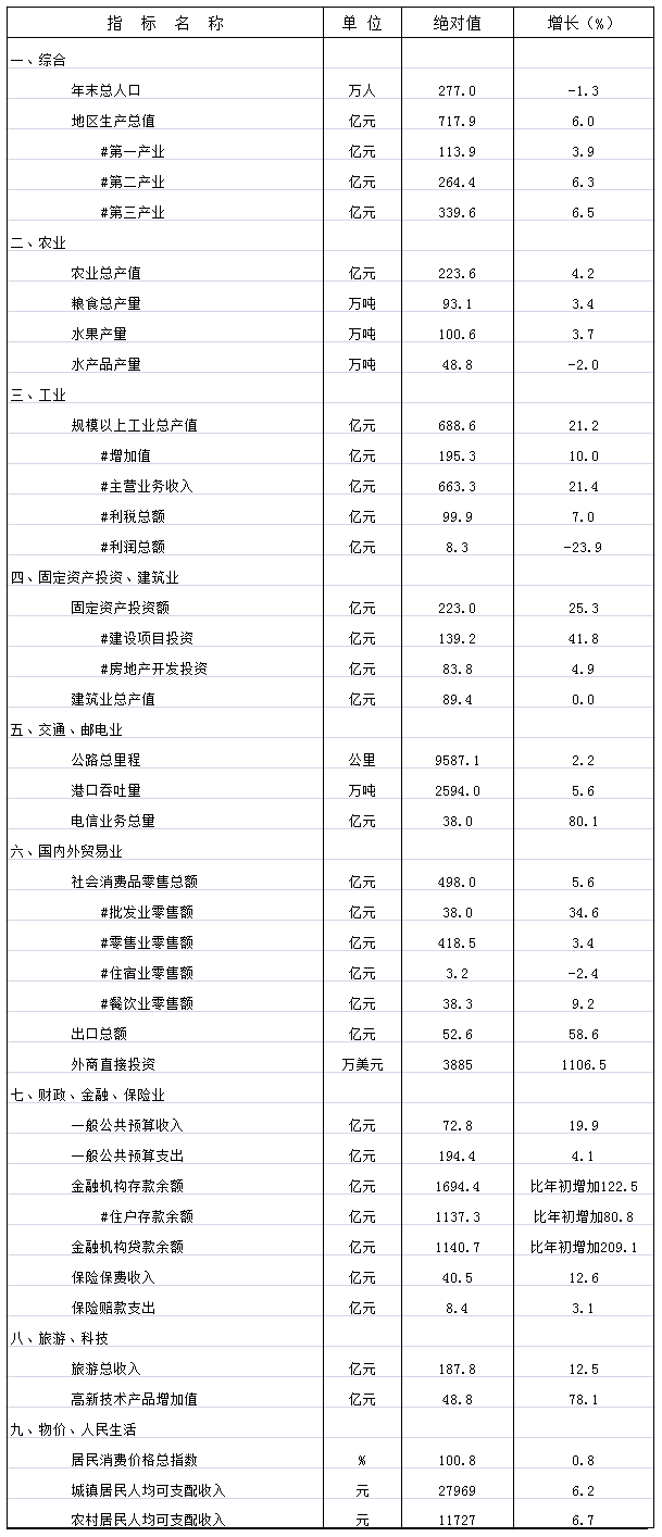 初步核算,全年地区生产总值717.9亿元,按可比价格计算,比上年增长6.0%。其中,第一产业增加值113.9亿元,增长3.9%;第二产业增加值264.4亿元,增长6.3%;第三产业增加值339.6亿元,增长6.5%。地区生产总值三次产业构成为15.9∶36.8∶47.3。