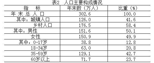 年末全市户籍人口302.6万人,其中,城镇人口126.0万人。全年人口出生率为5.5‰,比上年下降1.7个千分点。人口死亡率为8.6‰,比上年上升1.4个千分点。人口自然增长率为-3.1‰,比上年下降3.1个千分点。