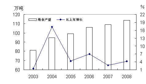 图2 2003-2008年粮食产量及其增长速度