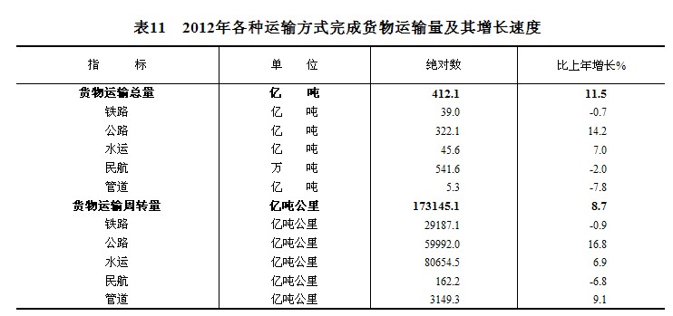 全年货物运输总量412亿吨,比上年增长11.5%。货物运输周转量173145亿吨公里,增长8.7%。全年规模以上港口完成货物吞吐量97.4亿吨,比上年增长6.8%,其中外贸货物吞吐量30.1亿吨,增长8.8%。规模以上港口集装箱吞吐量17651万标准箱,增长8.1%。