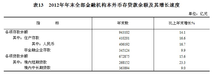 年末全部金融机构本外币各项存款余额94.3万亿元,比年初增加11.6万亿元,其中人民币各项存款余额91.8万亿元,增加10.8万亿元。全部金融机构本外币各项贷款余额67.3万亿元,增加9.1万亿元,其中人民币各项贷款余额63.0万亿元,增加8.2万亿元。全年社会融资规模[17]为15.8万亿元,按可比口径计算,比上年多2.9万亿元。
